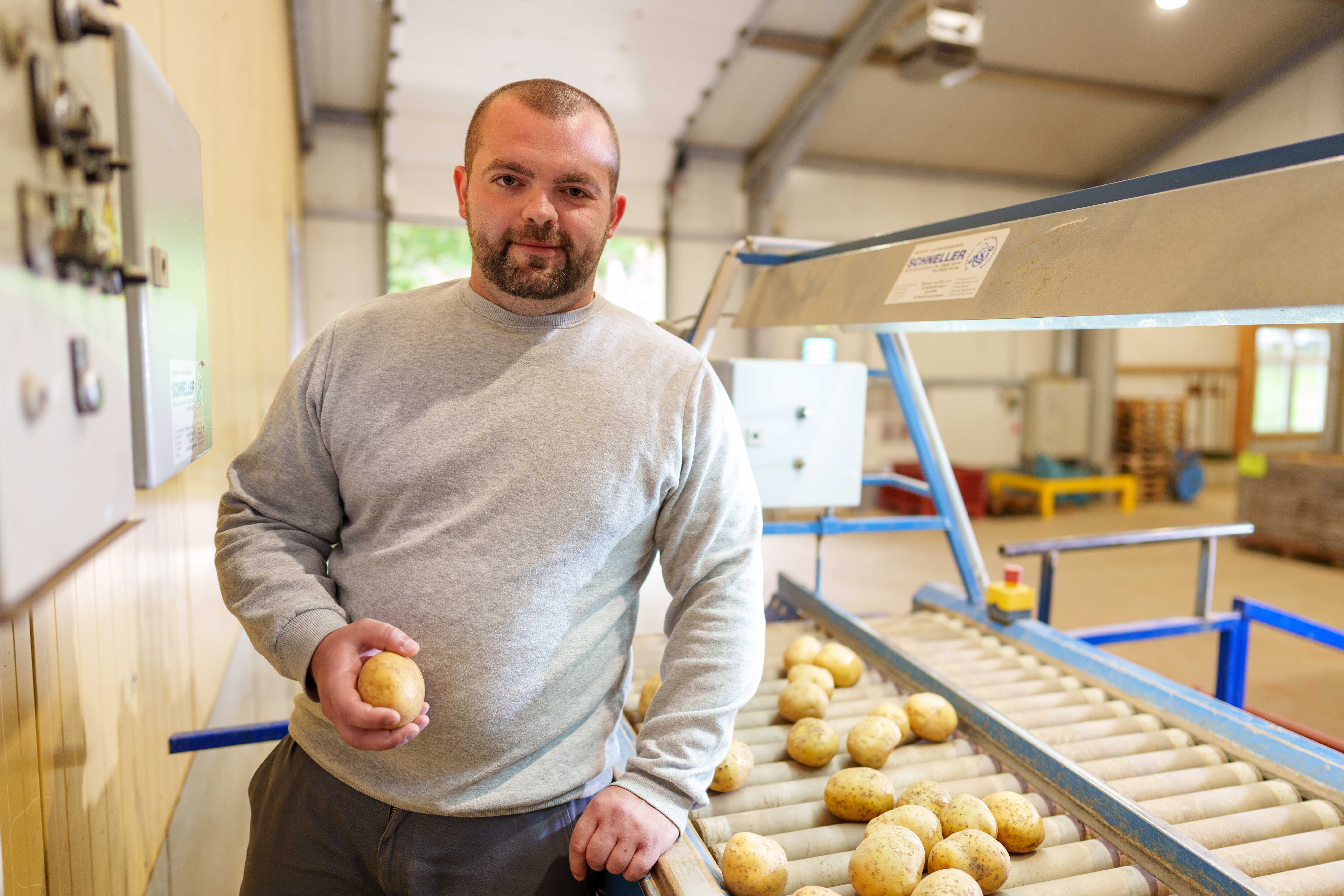 Tom Kraneis lebt jetzt ein abstinentes Leben. „Es war sehr mühselig. Die Gespräche mit den Mitarbeitern, der Tagesablauf und auch die Arbeit haben mir geholfen.“ Seit August lebt der 29-Jährige nicht mehr in der stationären Wohngruppe auf dem Hofgut, sondern mit drei anderen Klienten in der Außenwohngruppe in Spangenberg. Als einer von 19 Klient*innen in der Kartoffelverarbeitung des Hofguts sortiert, schält, vakuumiert und verpackt er Kartoffeln aus Hephata-Anbau und von regionalen Bioland-Produzenten. Manchmal liefert er die Kartoffeln auch an Kund*innen aus oder steht bei Festen an der großen Imbisspfanne und brät Kartoffeln mit Eiern und Speck für die Besucher*innen.