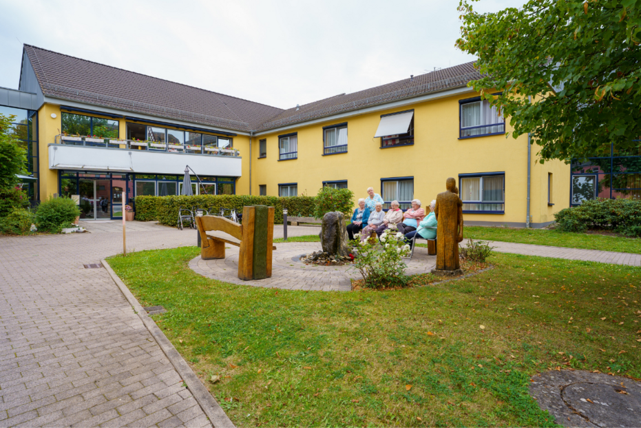 Die Seniorenwohnanlage Wiesenhof liegt auf einem parkähnlich gestalteten Grundstück. Die Einrichtung bietet Plätze für Senior*innen in allen Pflegestufen.