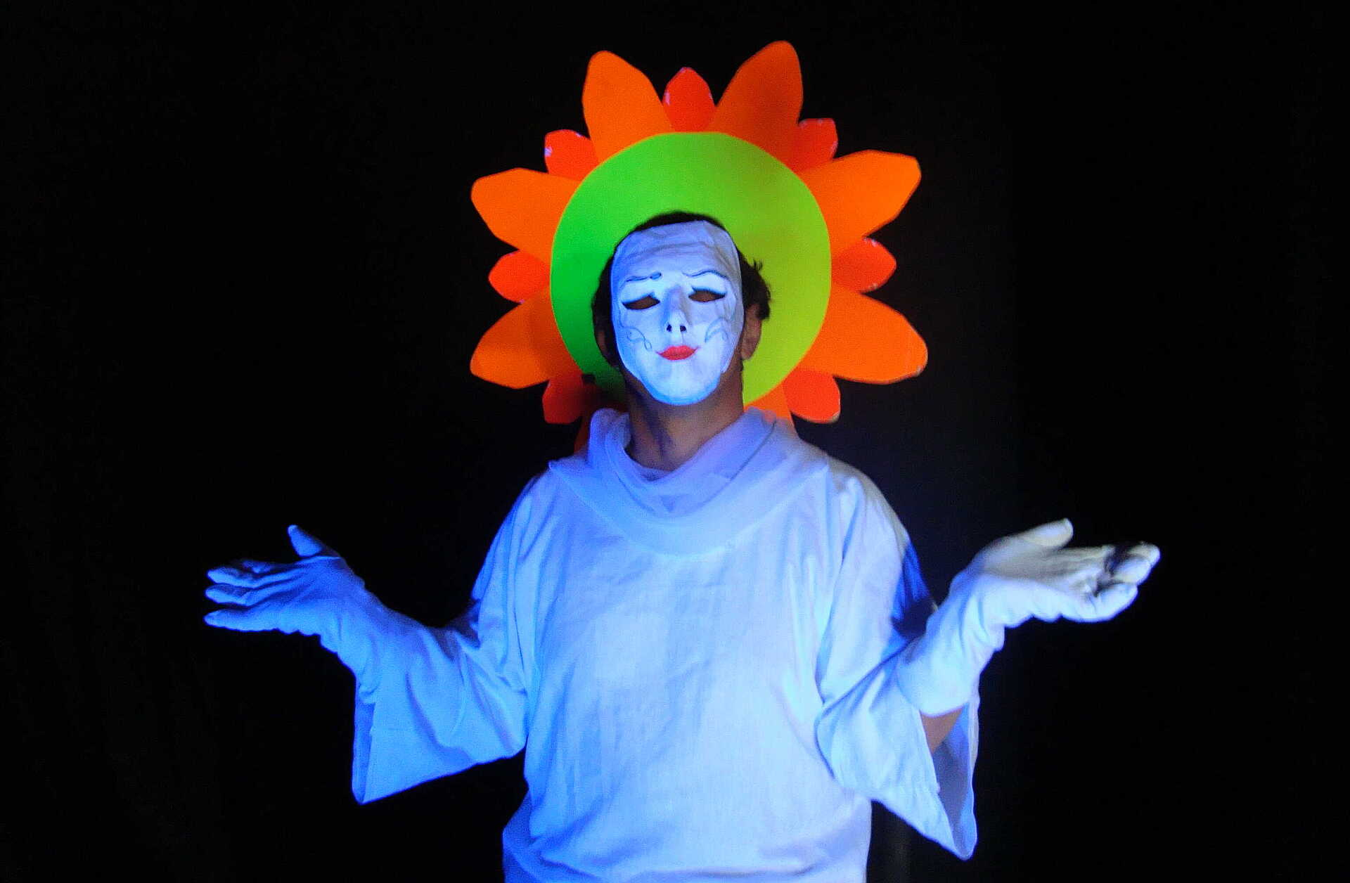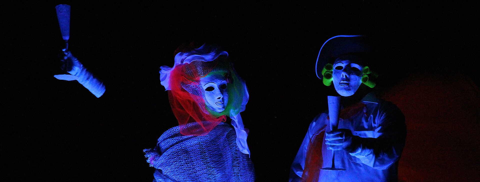Die Theaterwerkstatt Black Box führt Theaterstücke im Schwarzlicht mit außergewöhnlichen Effekten, Puppen und Masken auf. Die Requisiten und Masken erstellen die Black Box-Künstler*innen selbst.
