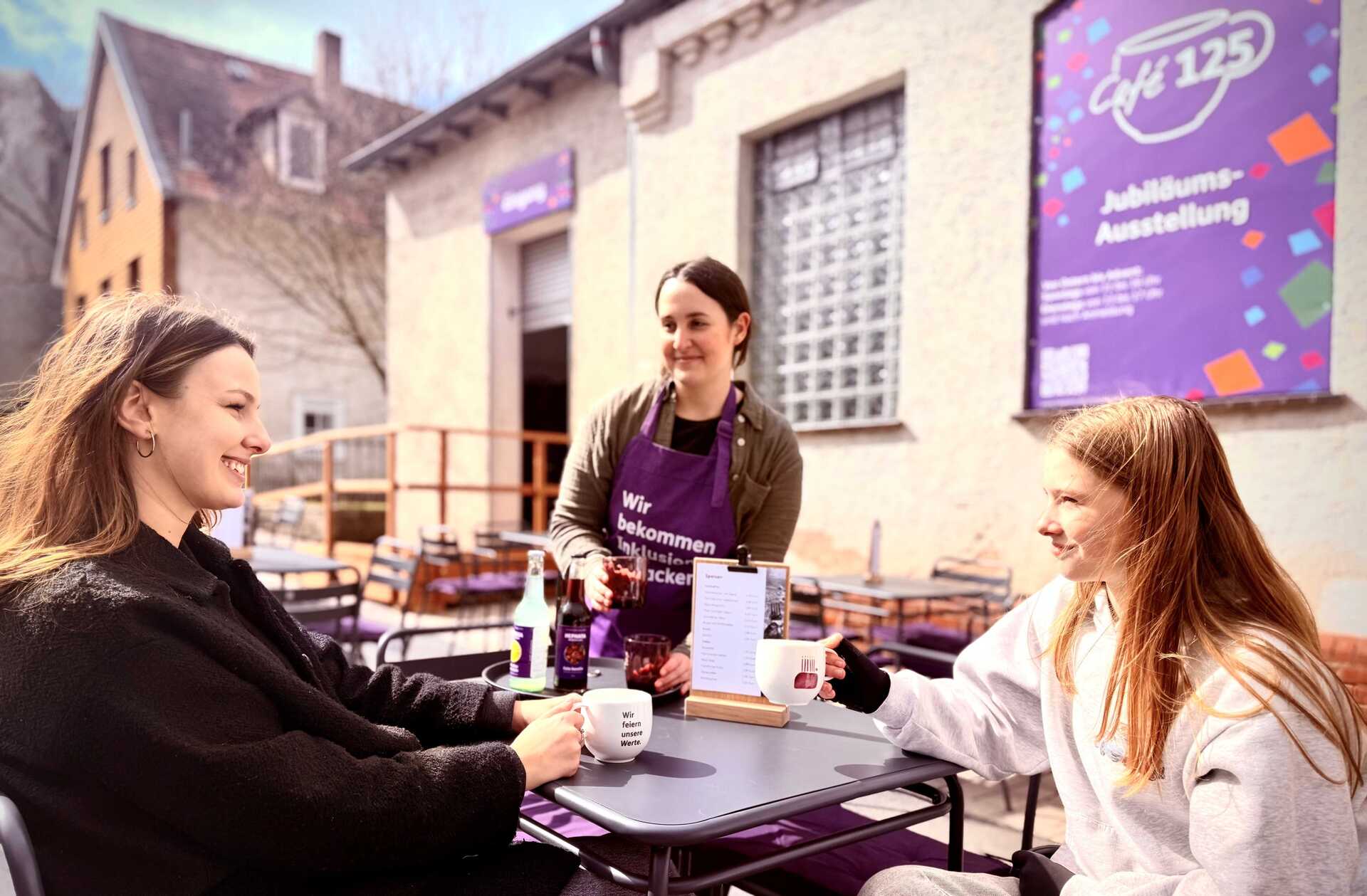 Durch die Ausstellung bummeln, die 125 Porträts bestaunen, selbst noch ein witziges Foto in der Fotobox knipsen und dann ein Stück Kuchen, eine Pizza oder einen kleinen Snack genießen: Das können sie im Café125. An sonnigen Tagen wird die Straße vor den Gebäude zum Straßencafé.