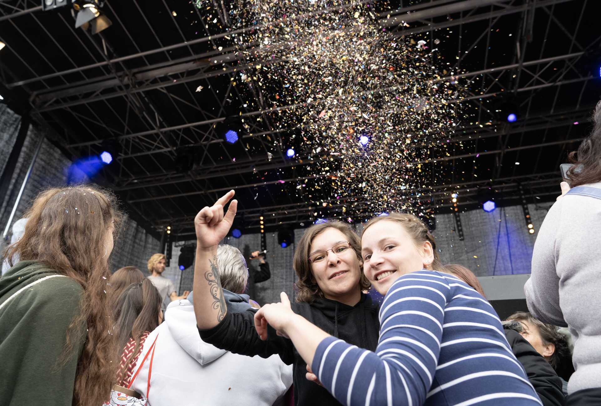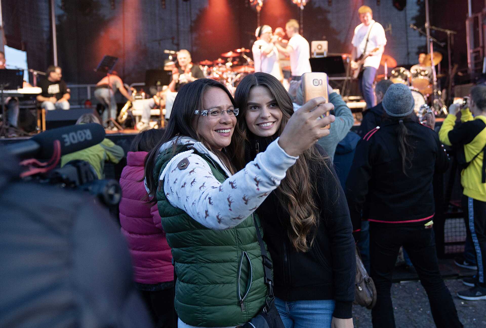 „Ich bin gestern Nacht angereist, das sind ungefähr 200 Kilometer von mir zu Hause“, sagte Lydia Hauske (22) aus Gau-Odernheim. Während sie schon mit Vicky Lindner (24) aus Oberaula am Bühnenrad stand, liefen auf der Bühne die Vorbereitungen für den Kreativ-Gottesdienst. Die beiden Frauen feierten diesen mit und rührten sich danach nicht mehr vom Fleck, schließlich galt es, den Platz zu behaupten: Für 17 Uhr hatte sich die Schlager-Boy-Group „Feuerherz“ angekündigt und mit ihr Fans aus ganz Deutschland. „Ich bin seit 2014 Fan, war auf mehr als 100 Konzerten. Ich habe heute für Sebastian ein Lebkuchenherz dabei, das gebe ich ihm in der Autogrammstunde“, sagte Vicky Lindner.
