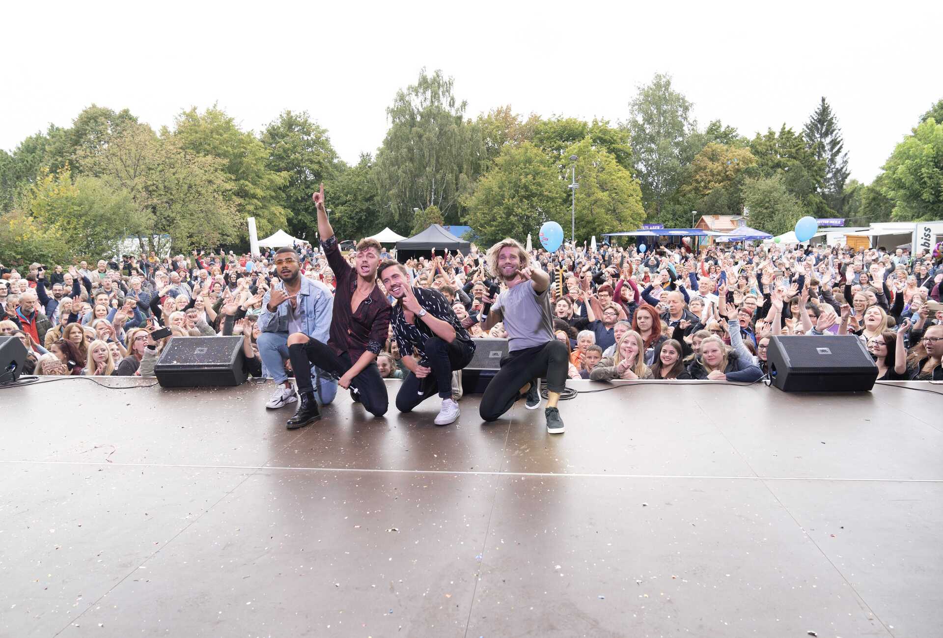 Die fand im Anschluss an das einstündige Konzert statt. Bei dem hatten die vier Feuerherzen alles gegeben. Im Konfettiregen und Blitzlichtgewitter der Handykameras gaben sie Hits wie „In meinen Träumen ist die Hölle los“, „Tu’s noch mal“ und „Wer kann denn da schon nein sagen?“ zum Besten. Dabei begeisterten Sebastian, Karsten, Dominique und Matt ihr zumeist weibliches Publikum mit ausgefeilten Tanz-Choreographien. Neben Lydia Hauske, Vicky Lindner und ihrer Mutter Martina Lindner sowie Regina Lutzke aus Wohratal-Langendorf, die sich für das Konzert verabredet hatten, ließen sich das rund 2.000 Menschen nicht entgehen.