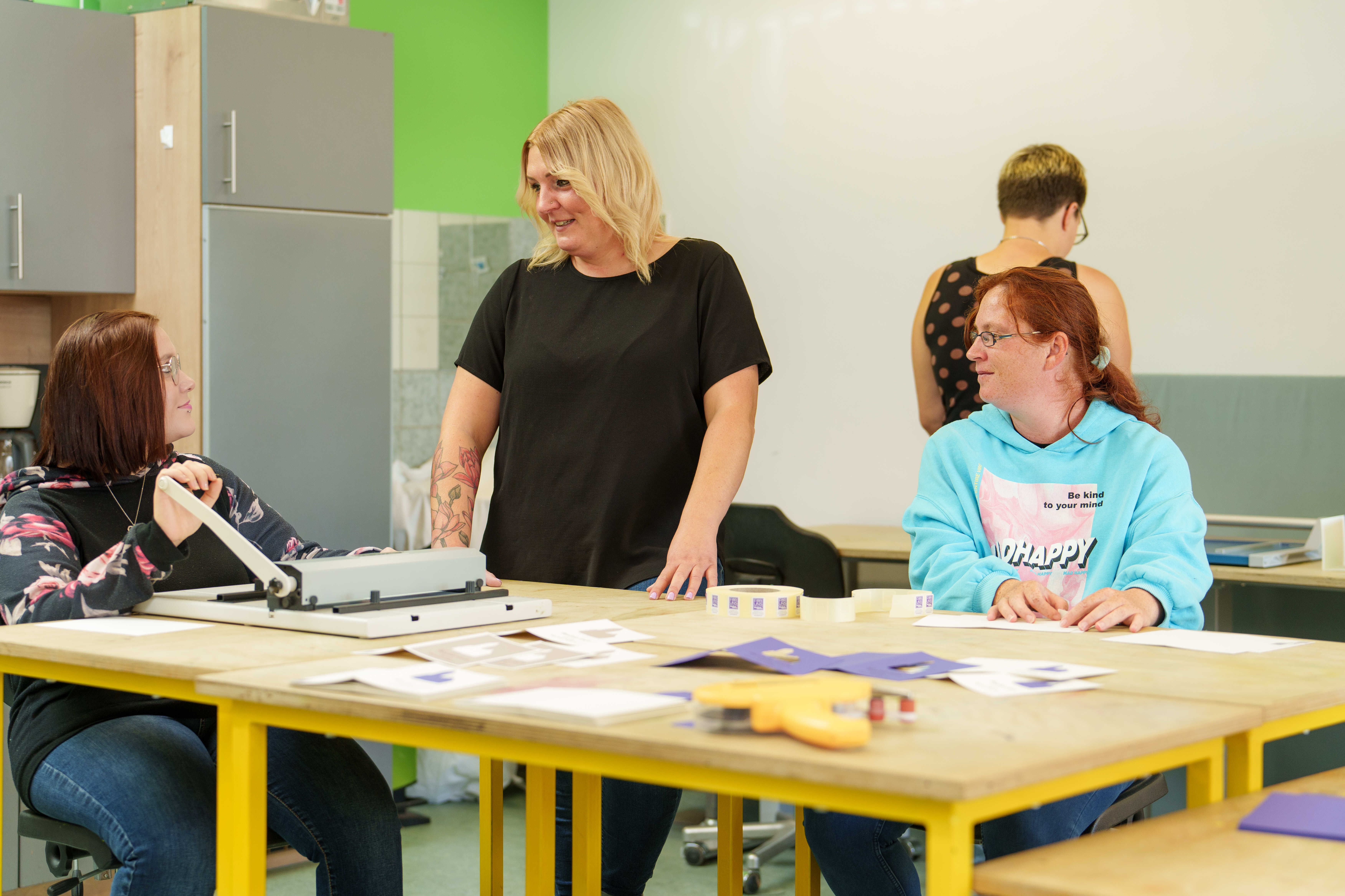 Im Rahmen einer Führung erhalten die Teilnehmenden Einblicke in die vielfältigen Arbeitsbereiche sowie die Produkte und Dienstleistungen der Werkstätten für Menschen mit Behinderungen (WfbM) am Lindenplatz in Treysa. Im Anschluss gestalten sie gemeinsam mit Klient*innen und Mitarbeitenden der Werkstatt ihre persönlichen Grußkarten.