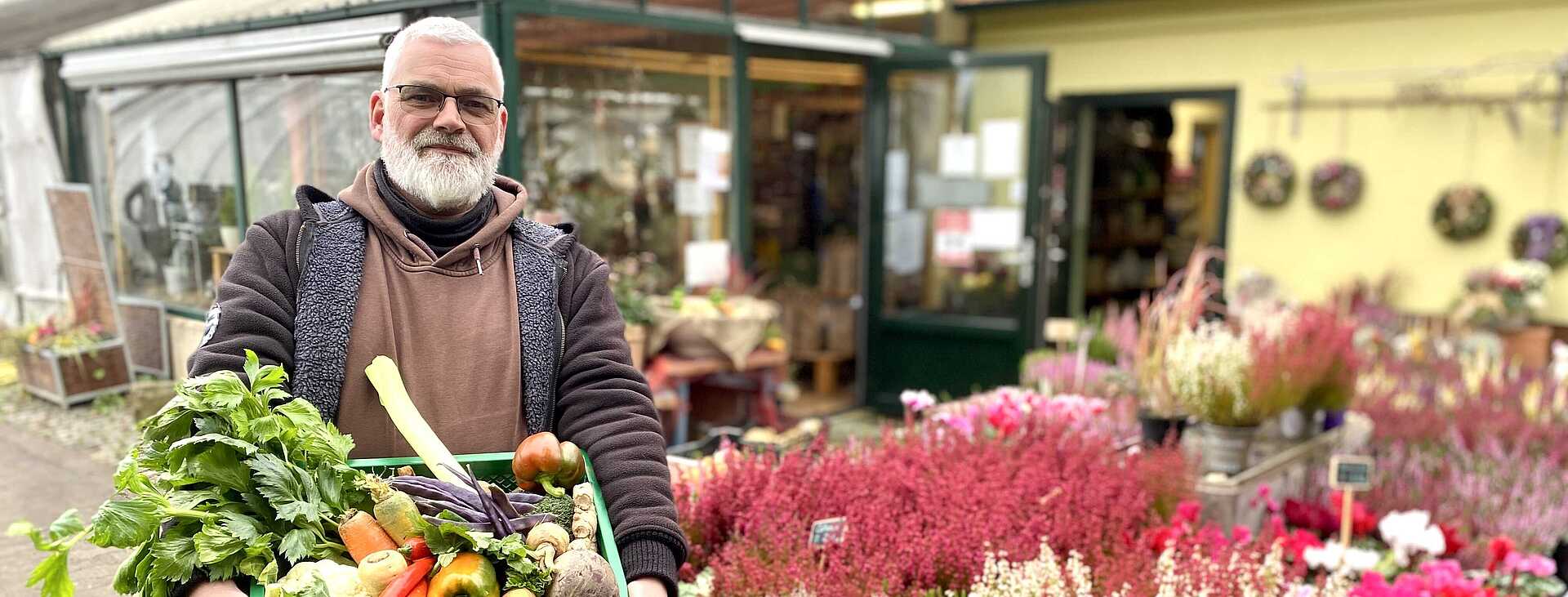 „Viele WfbMs haben eine Gärtnerei. Unsere Besonderheit ist die Vielfalt und die Bioland-Zertifizierung“, sagt Klaus Lewinsohn (48), Leiter der Gärtnerei. „Kontinuität und Entwicklung zeichnen die Gärtnerei bis heute aus.“ Lewinsohn hat nur vier Vorgänger, die jeweils fast 30 Jahre lang die Gärtnerei führten. Er selbst ist seit Februar 2020 im Amt. Der Handel mit gesundem Gemüse ist sein Thema. 2021 gingen mit den „Schwälmer Rübchen“ die ersten Bioland-zertifizierten Produkte in den Verkauf. „Im Frühjahr werden wir die ersten zertifizierten Zierpflanzen verkaufen können, danach auch die Topfkräuter. Die komplette Gemüse-Umstellung wird zwei Jahre dauern.“