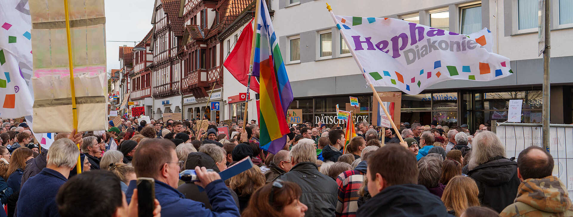 Mehr als 2.000 Menschen haben den beiden Beifall gegeben. Die Idee zur Demonstration haben der „Arbeitskreis für Toleranz und Menschenwürde“ und die „Freund*innen der Demokratie“ gehabt. Die Idee haben mehr als 50 Gruppen, Unternehmen und Vereine unterstützt. Zwei davon sind die Hephata Diakonie und die Diakonische Gemeinschaft Hephata gewesen. Die Demonstration in der Treysaer Bahnhofstraße ist die erste gegen Rechtsextremismus im Schwalm-Eder-Kreis gewesen.