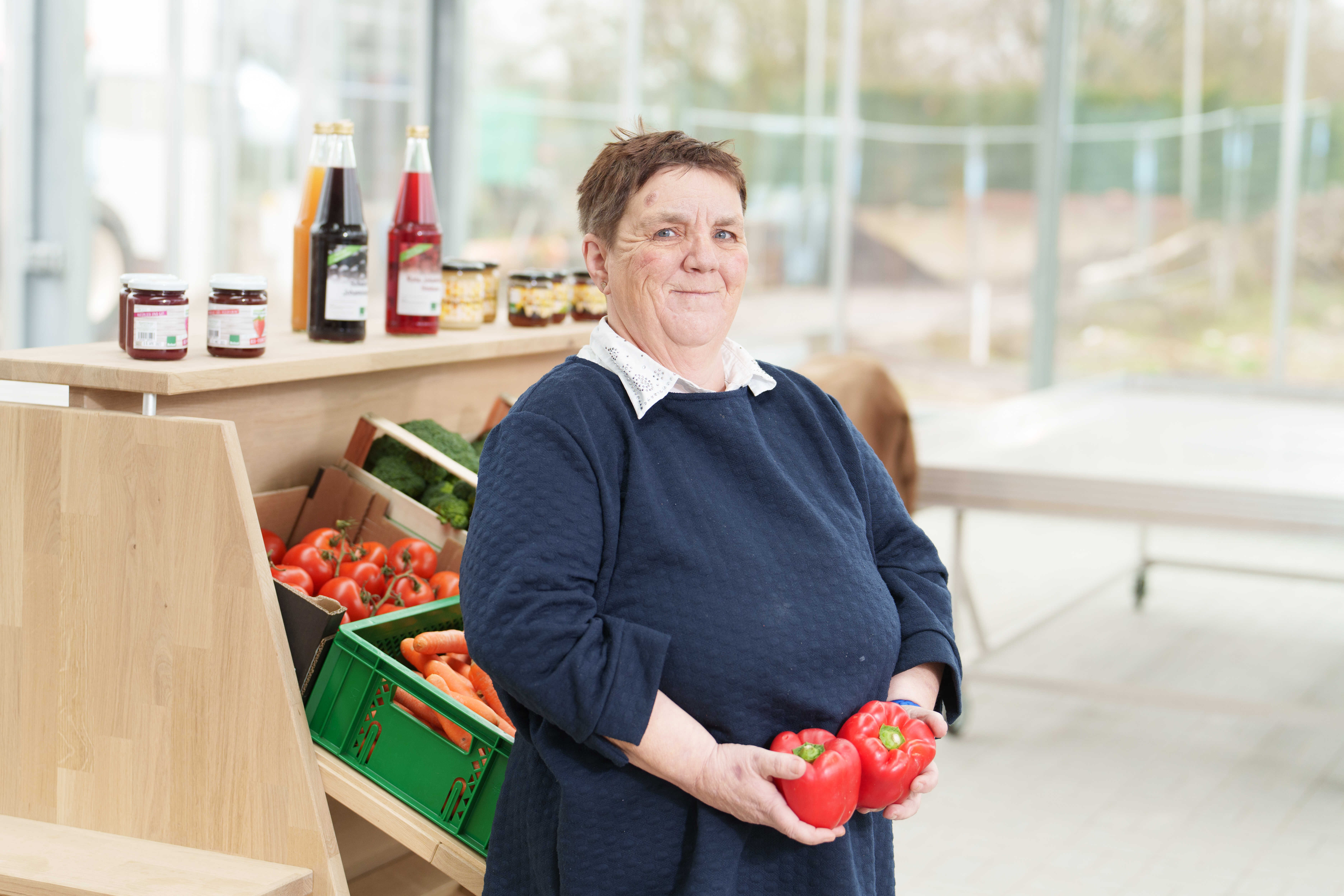 „Die Regale aus Holz gefallen mir sehr gut. Und alles ist so schön hell und groß“, sagt Sabine Schäfer (54). Sie wohnt im Betreuten Wohnen und arbeitet seit 35 Jahren in der Gärtnerei der Sozialen Teilhabe.