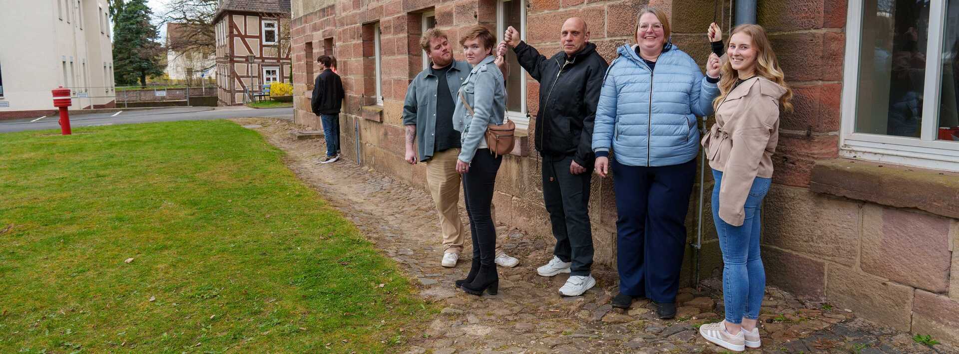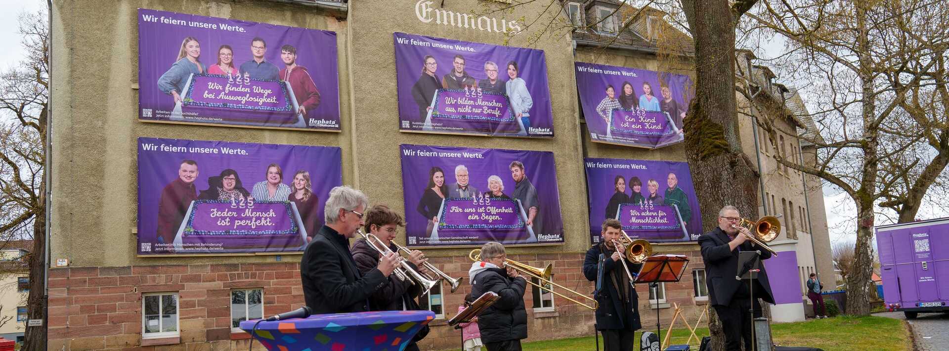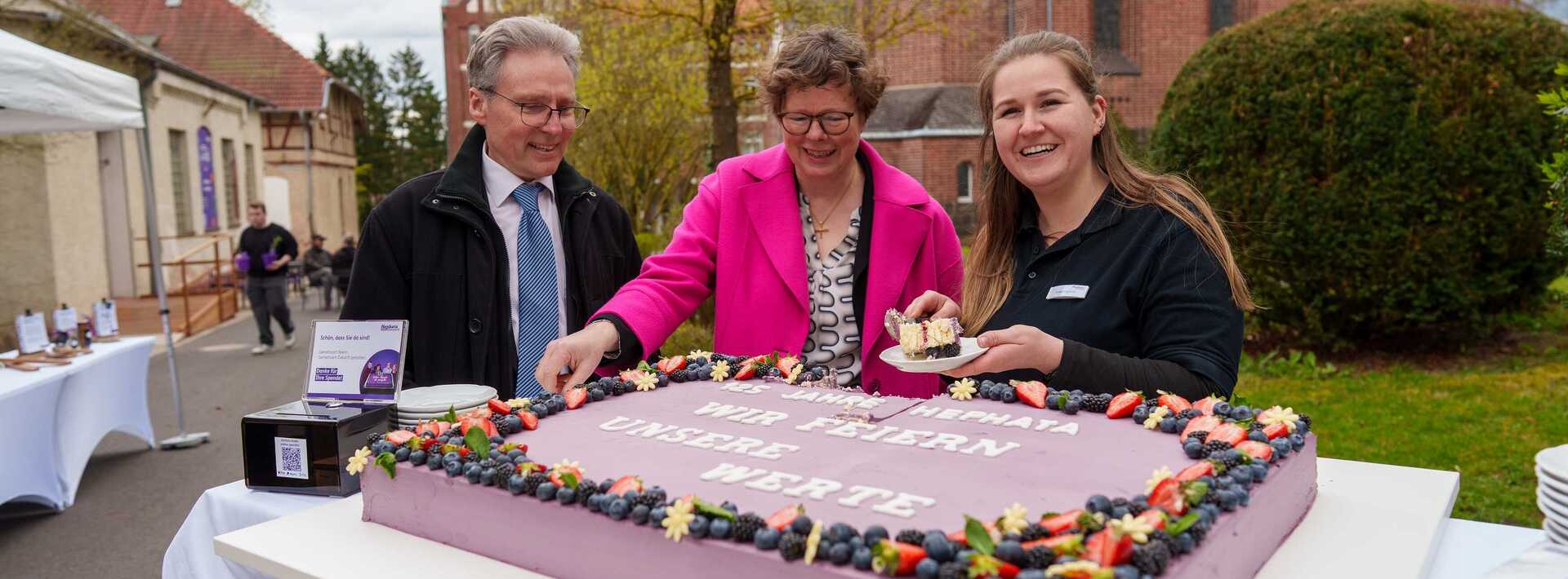 Im Anschluss an den Gottesdienst präsentierten Beate Hofmann, die beiden Hephata-Vorstände Maik Dietrich-Gibhardt und Stefan Gerland sowie Mitarbeiter*innen und Klient*innen Hephatas die sechs Jubiläums-Motive. Diese zeigen unter dem gemeinsamen Motto „Wir feiern unsere Werte“ sechs zentrale Botschaften Hephatas. Bei den Fotoshootings wirkten ehemalige und aktuelle Mitarbeiter*innen und Klient*innen mit. Die entstandenen Motive wurden dann am Sonntag als Großplakate am Haus Emmaus neben der Hephata-Kirche entrollt. Auf jedem Plakat ist auch eine Geburtstagstorte zu sehen. Diese galt es im Anschluss an die Präsentation dann auch wirklich zu genießen. Die beiden Hephata-Vorstände und Beate Hofmann schnitten die Torte an und servierten diese an die Gäste. Zudem warteten Imbiss, Kuchen und Getränke auf die Besucherinnen, bevor um 13 Uhr die Ausstellung: „Hephata: 125 Jahre – 125 Gesichter“ eröffnet wurde.