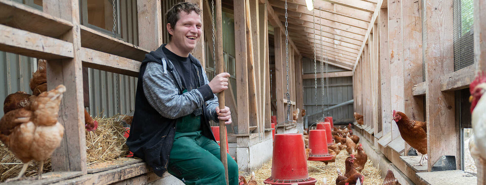 In unserer sozialen Landwirtschaft arbeiten Menschen, die in ihren sozialen, körperlichen oder geistigen Möglichkeiten so beeinträchtigt sind, dass sie in einer rein auf Effizienz ausgerichteten Arbeitswelt kaum Beschäftigung finden. Dort finden sie eine sinnvolle Beschäftigung und erzeugen hochwertige Lebensmittel nach Bioland-Richtlinien.