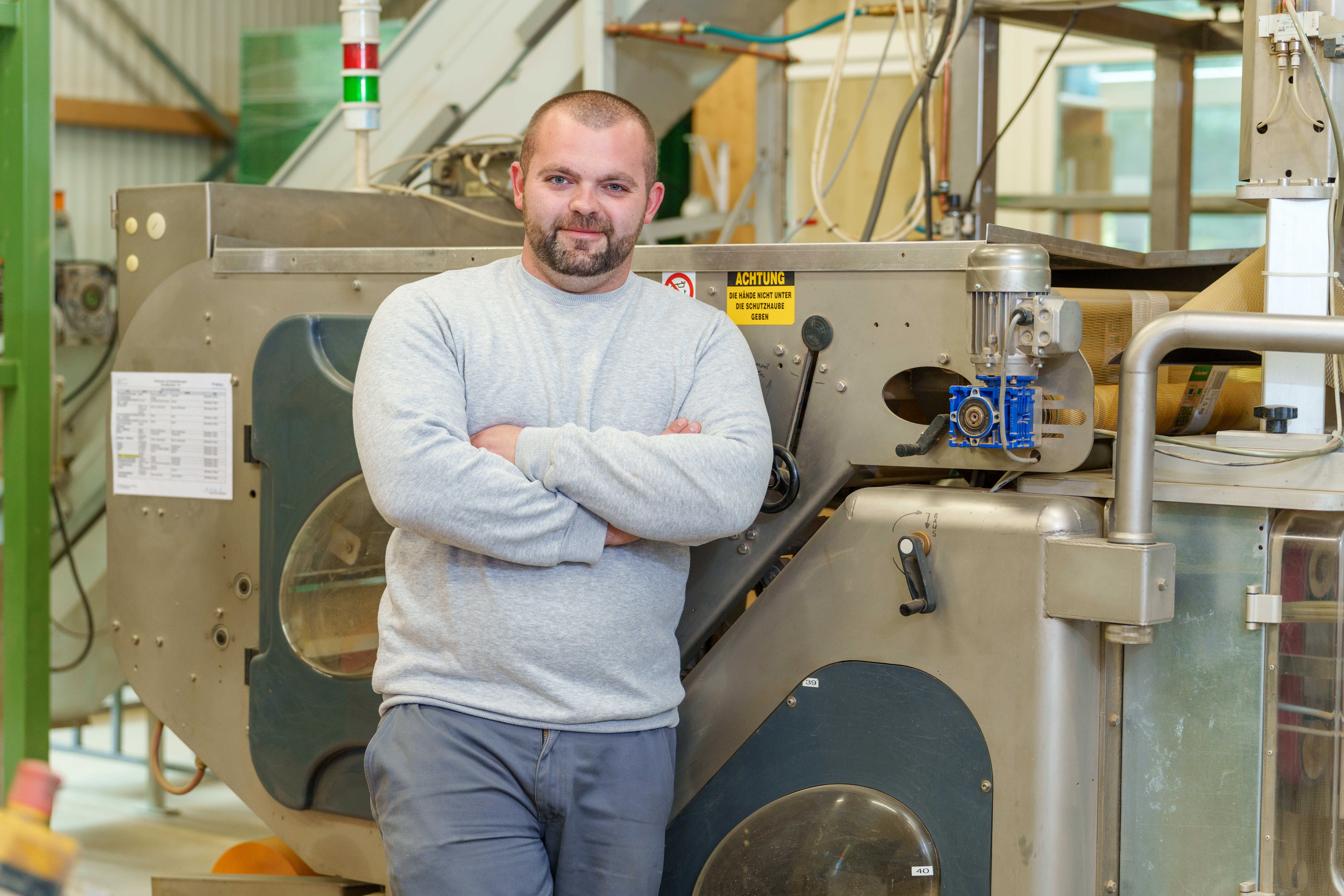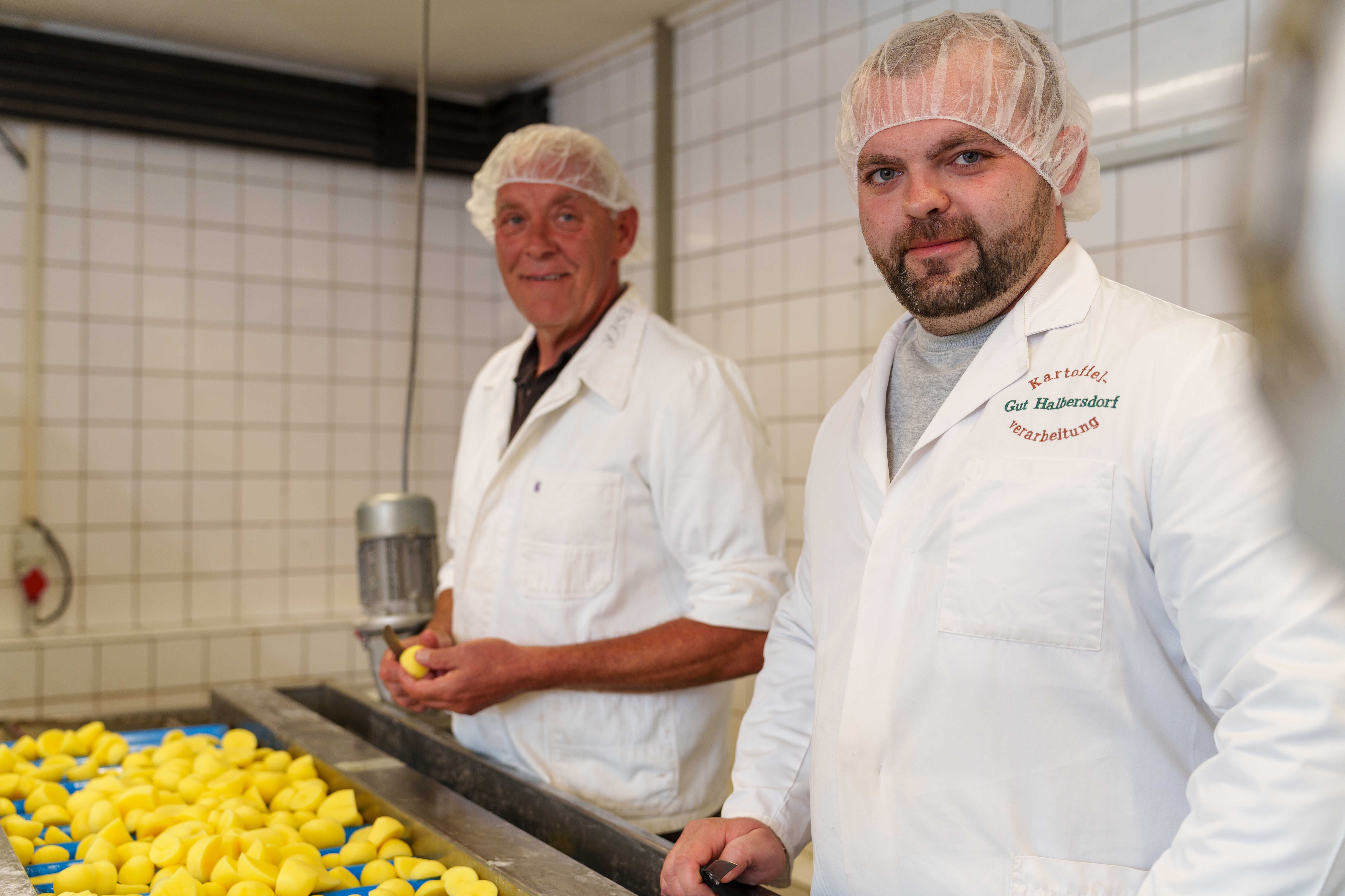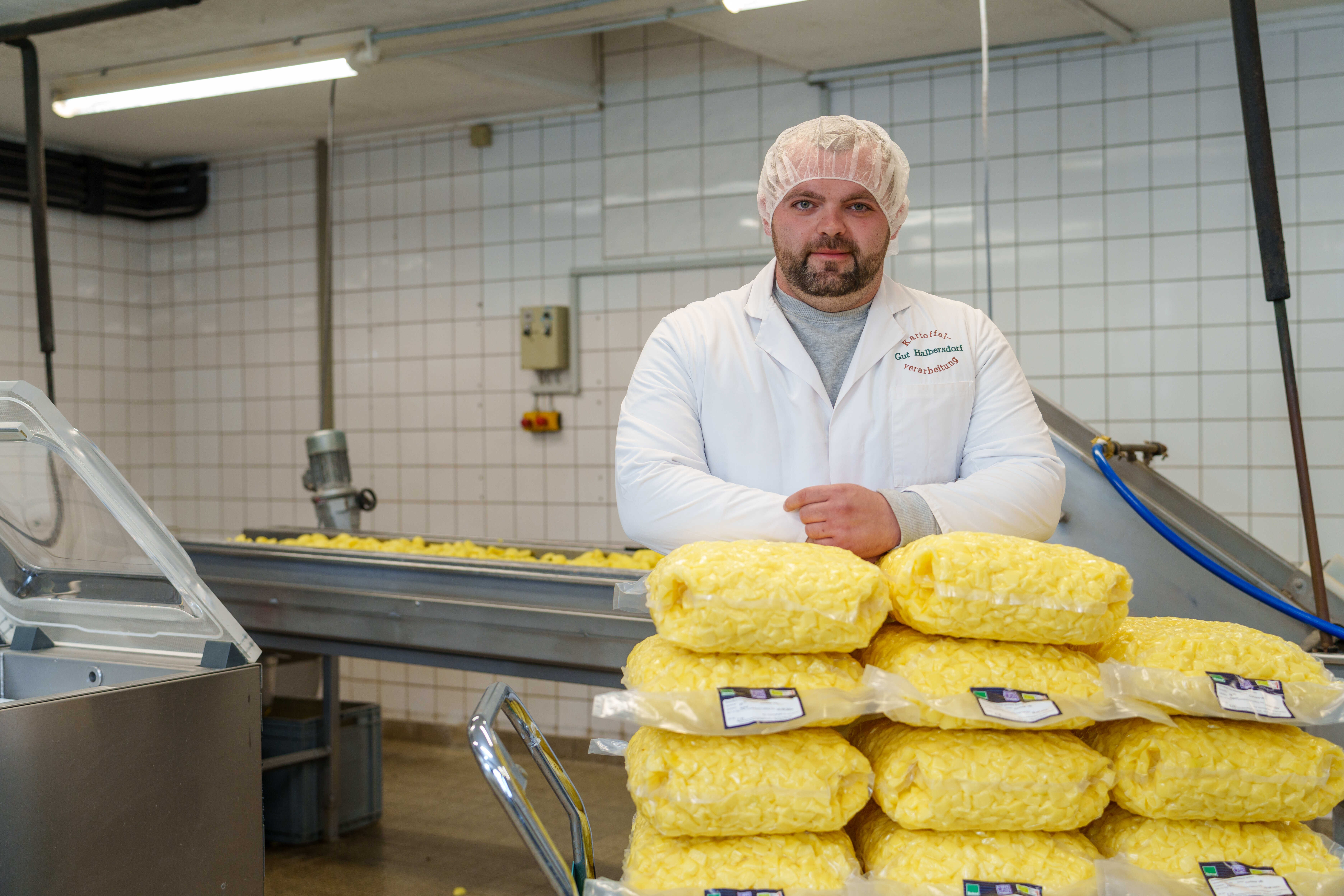 Tom Kraneis lebt jetzt ein abstinentes Leben. „Es war sehr mühselig. Die Gespräche mit den Mitarbeitern, der Tagesablauf und auch die Arbeit haben mir geholfen.“ Seit August lebt der 29-Jährige nicht mehr in der stationären Wohngruppe auf dem Hofgut, sondern mit drei anderen Klienten in der Außenwohngruppe in Spangenberg. Als einer von 19 Klient*innen in der Kartoffelverarbeitung des Hofguts sortiert, schält, vakuumiert und verpackt er Kartoffeln aus Hephata-Anbau und von regionalen Bioland-Produzenten. Manchmal liefert er die Kartoffeln auch an Kund*innen aus oder steht bei Festen an der großen Imbisspfanne und brät Kartoffeln mit Eiern und Speck für die Besucher*innen.