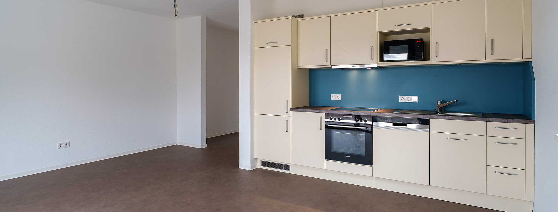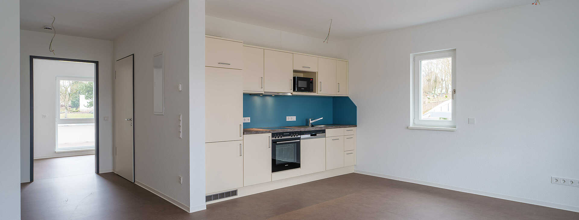 In der zweiten Etage befinden sich die vier Wohnungen für Menschen ohne Behinderungen oder für das Betreute Wohnen. Jede Wohnung hat ein eigenes Bad und eine Küchenzeile.