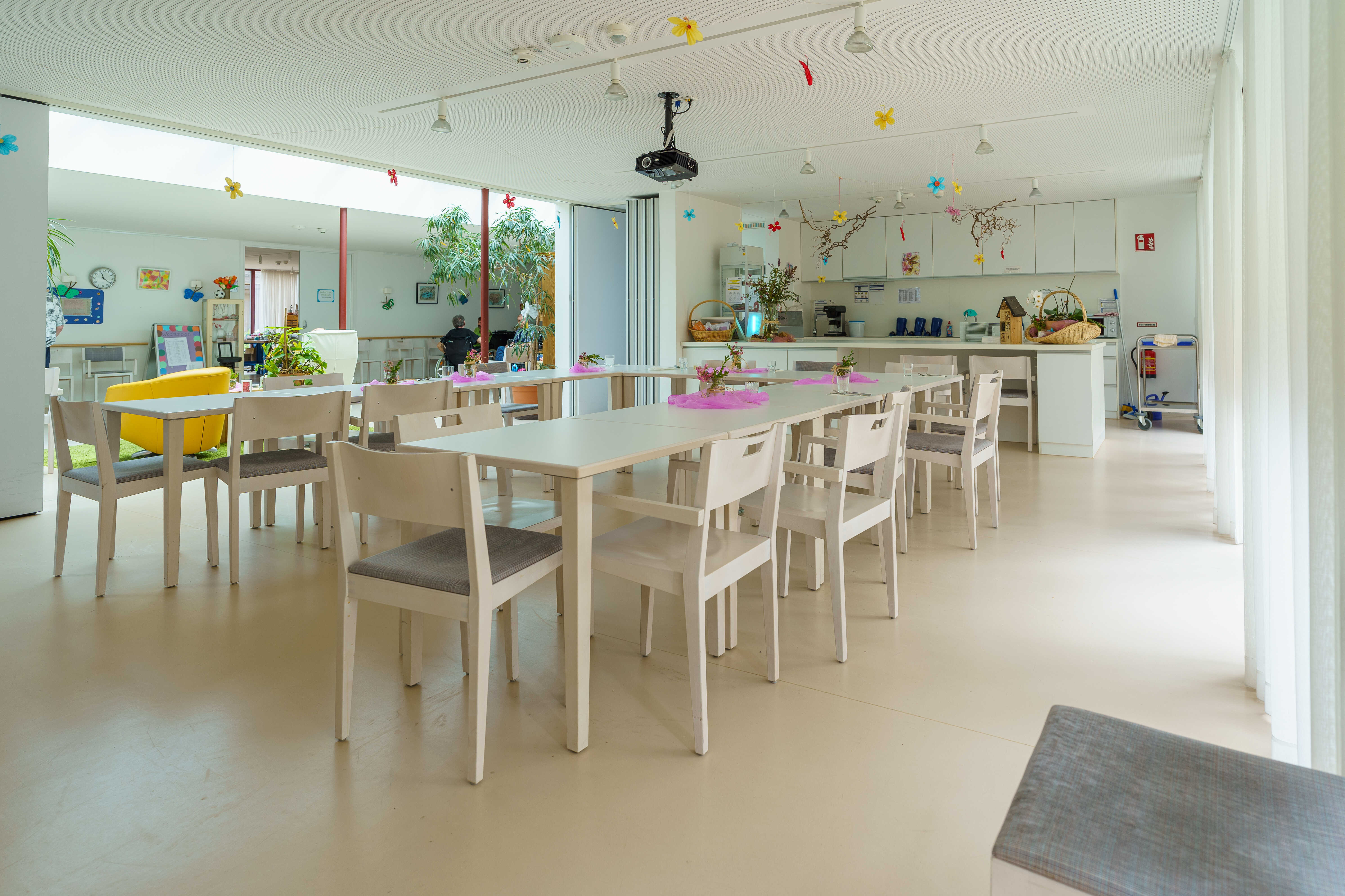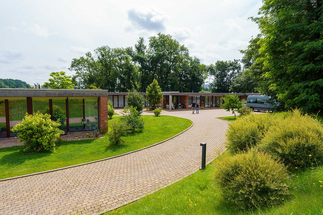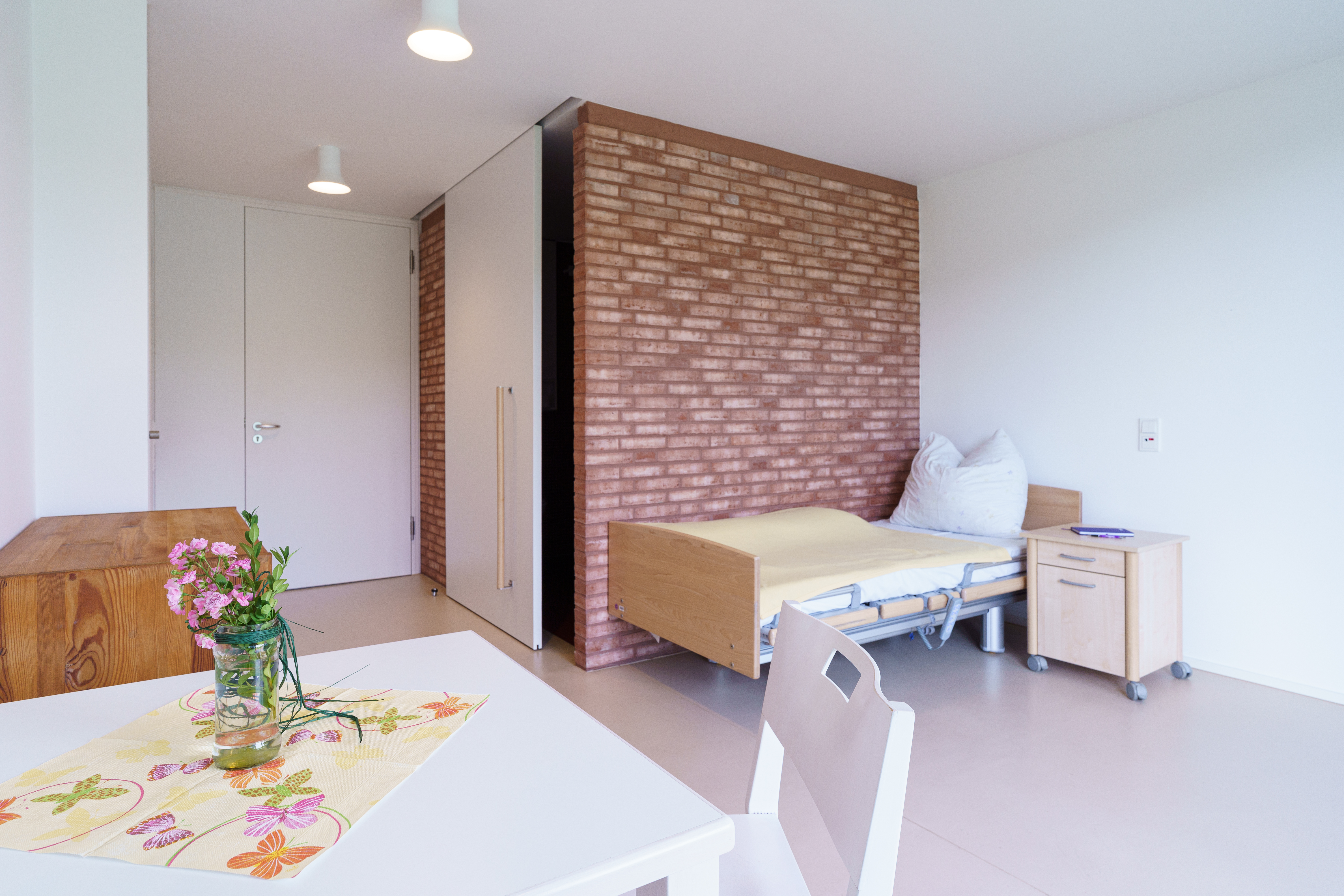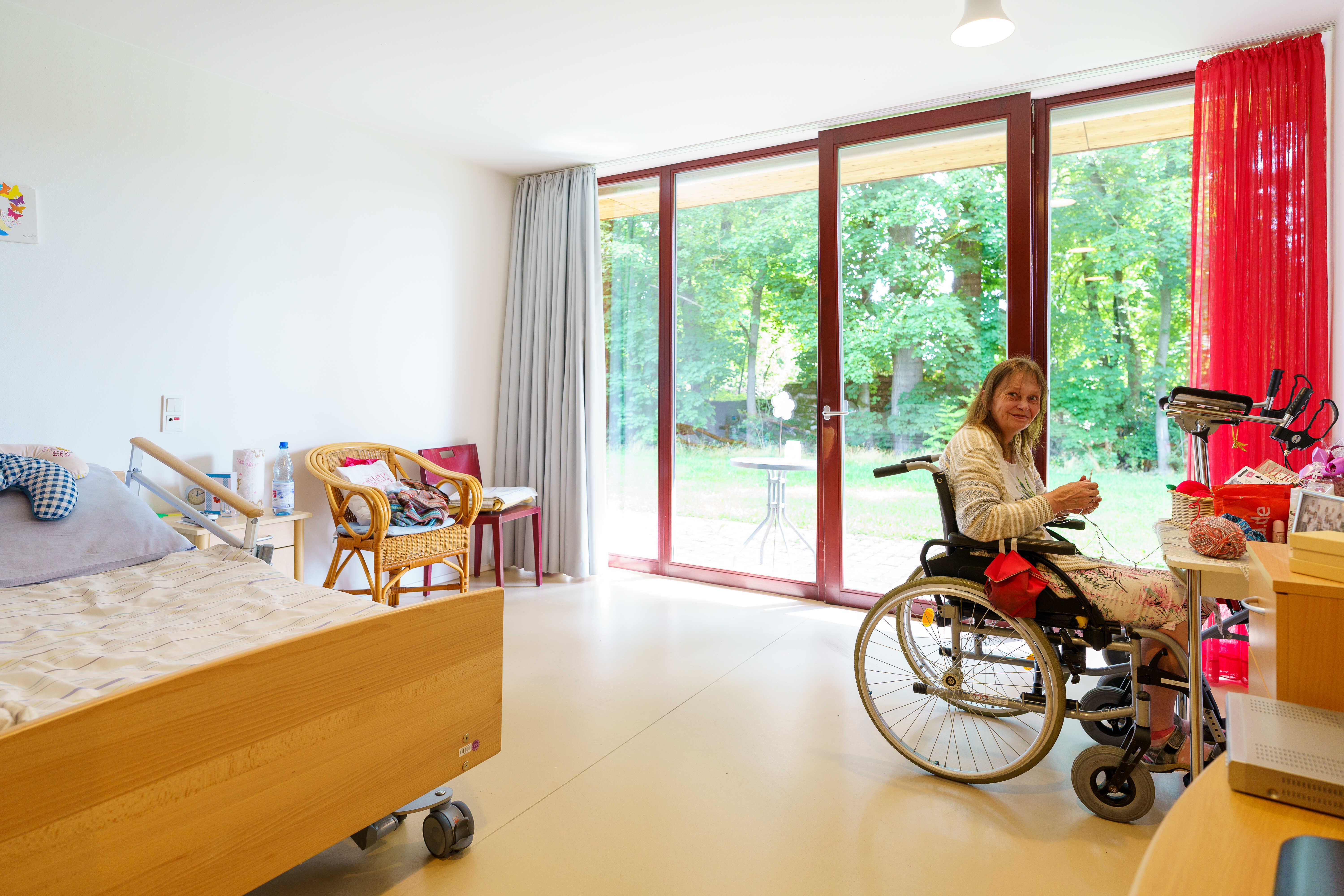 Umgeben von einem großzügigen Gelände mit eigenem Garten, verfügt das "Haus im Burggarten" über vier Wohngruppen mit jeweils neun Plätzen. Jede Wohngruppe hat einen eigenen Aufenthaltsbereich mit eigener Küche, in dem die Mahlzeiten gemeinsam eingenommen werden. Außerdem kann man dort Gesellschaftsspiele spielen oder sich mit anderen Bewohner*innen unterhalten. Die Zimmer verfügen über ein Pflegebett, einen Schrank mit Wertfach, einen Nachttisch und einen Stuhl.