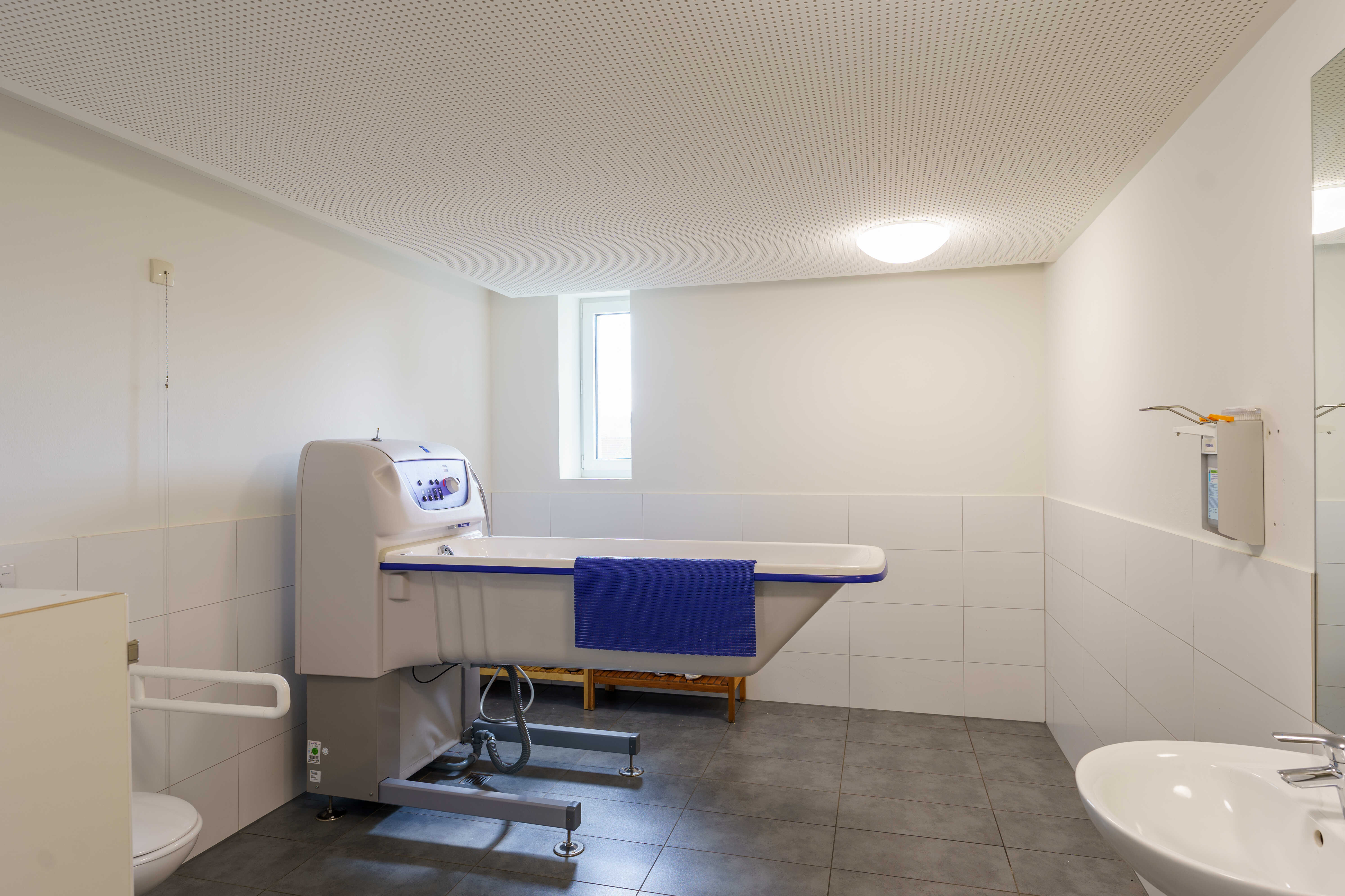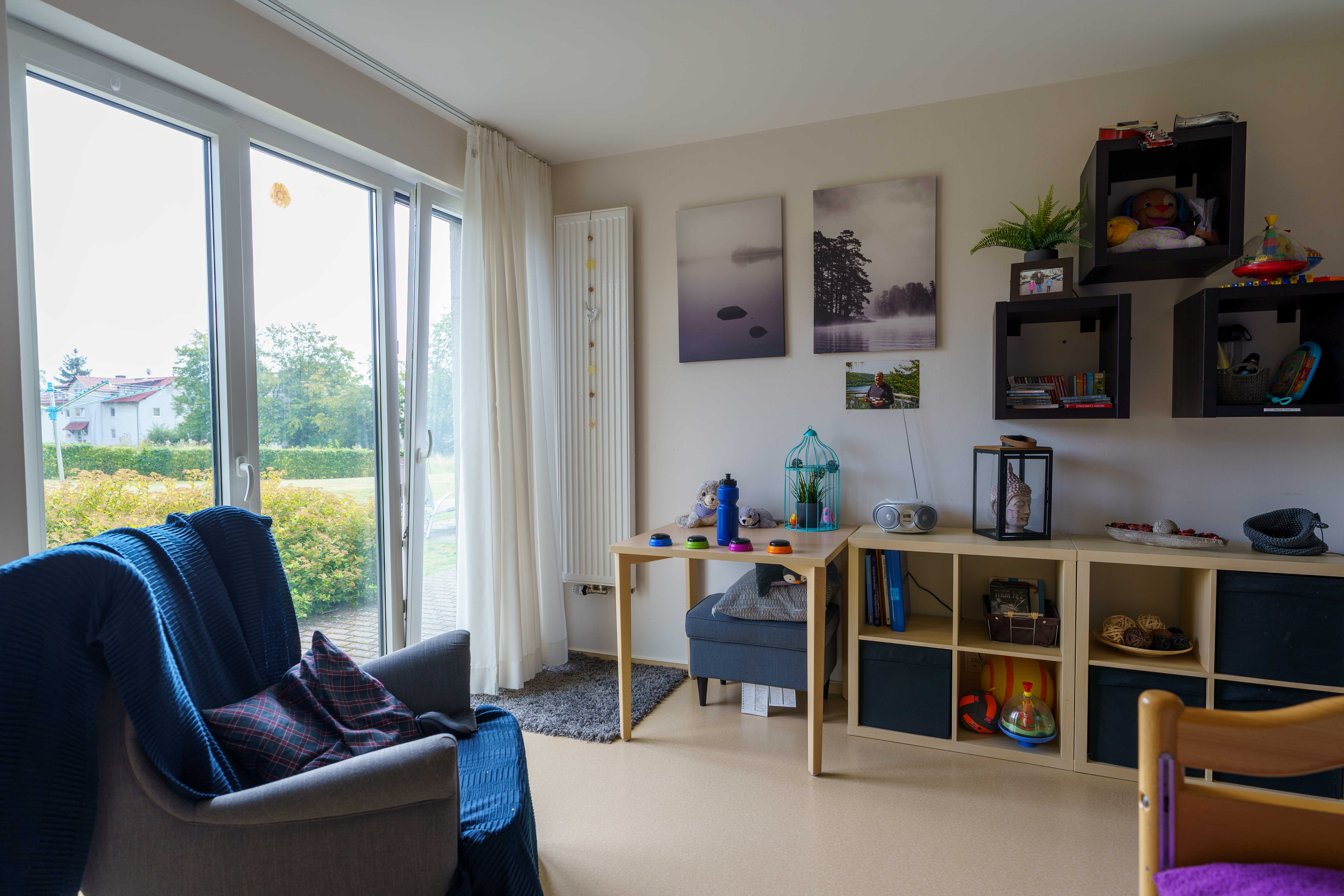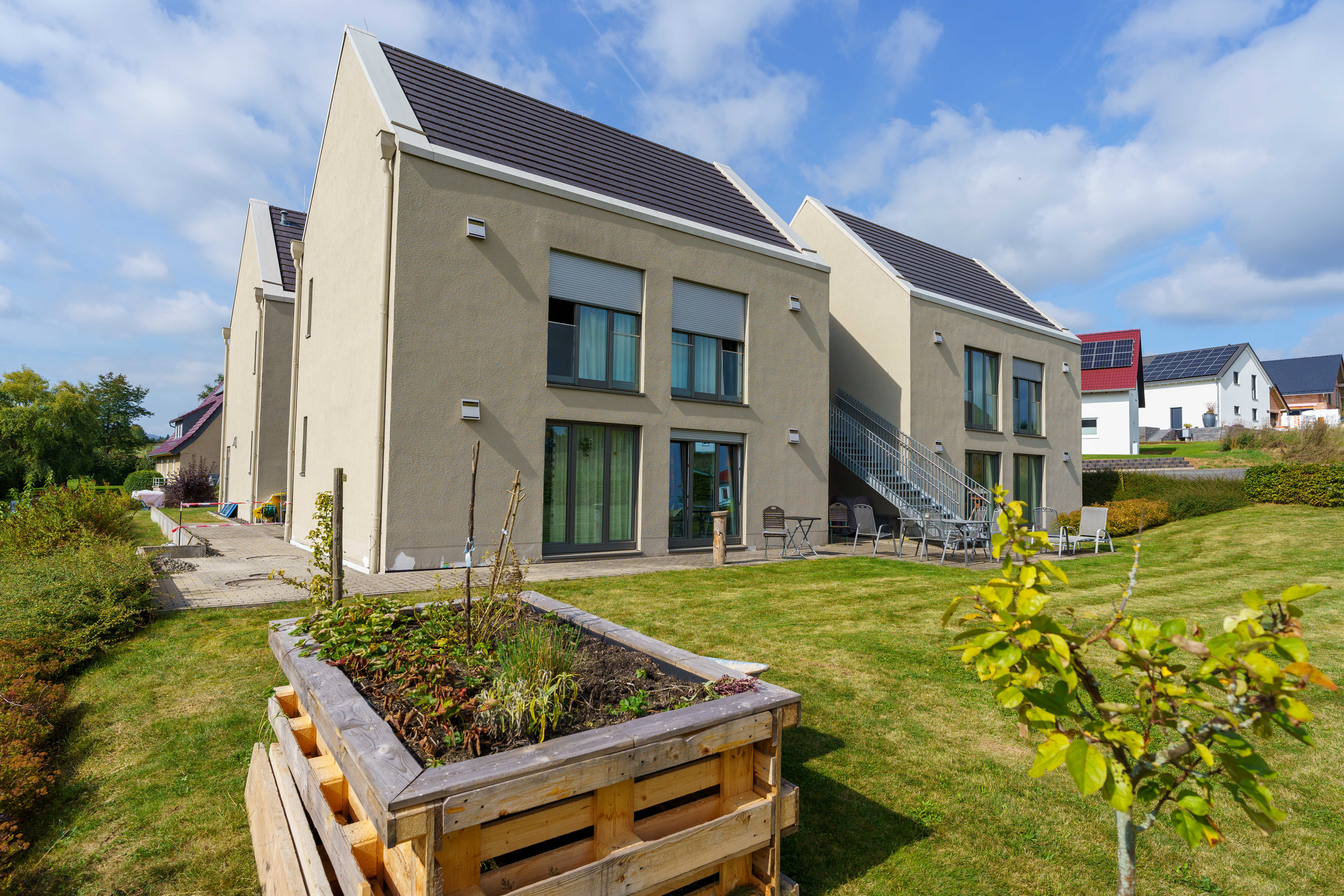 Das Wohnhaus „Knüllstraße 6" befindet sich in einem Wohngebiet fußläufig zum Ortskern von Jesberg. Im zweigeschossigen, barrierefreien Haus befinden sich 14 Einzelzimmer, jeweils zwei Klient*innen teilen sich ein Bad, ein Pflegebad mit Wanne ist vorhanden.