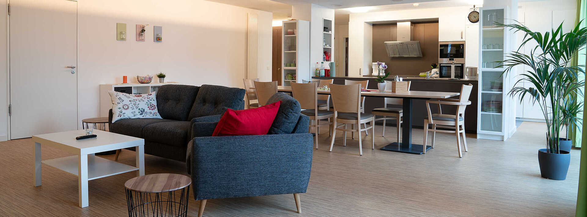 Das Haus hat zwei Etagen, einen Aufzug und ist barrierefrei. In jeder Etage gibt es eine Wohngemeinschaft. Hier leben die Bewohner*innen in Einzelzimmern und teilen sich eine Küche sowie ein Wohn- und Esszimmer. Jeweils zwei Bewohner*innen nutzen ein Bad.