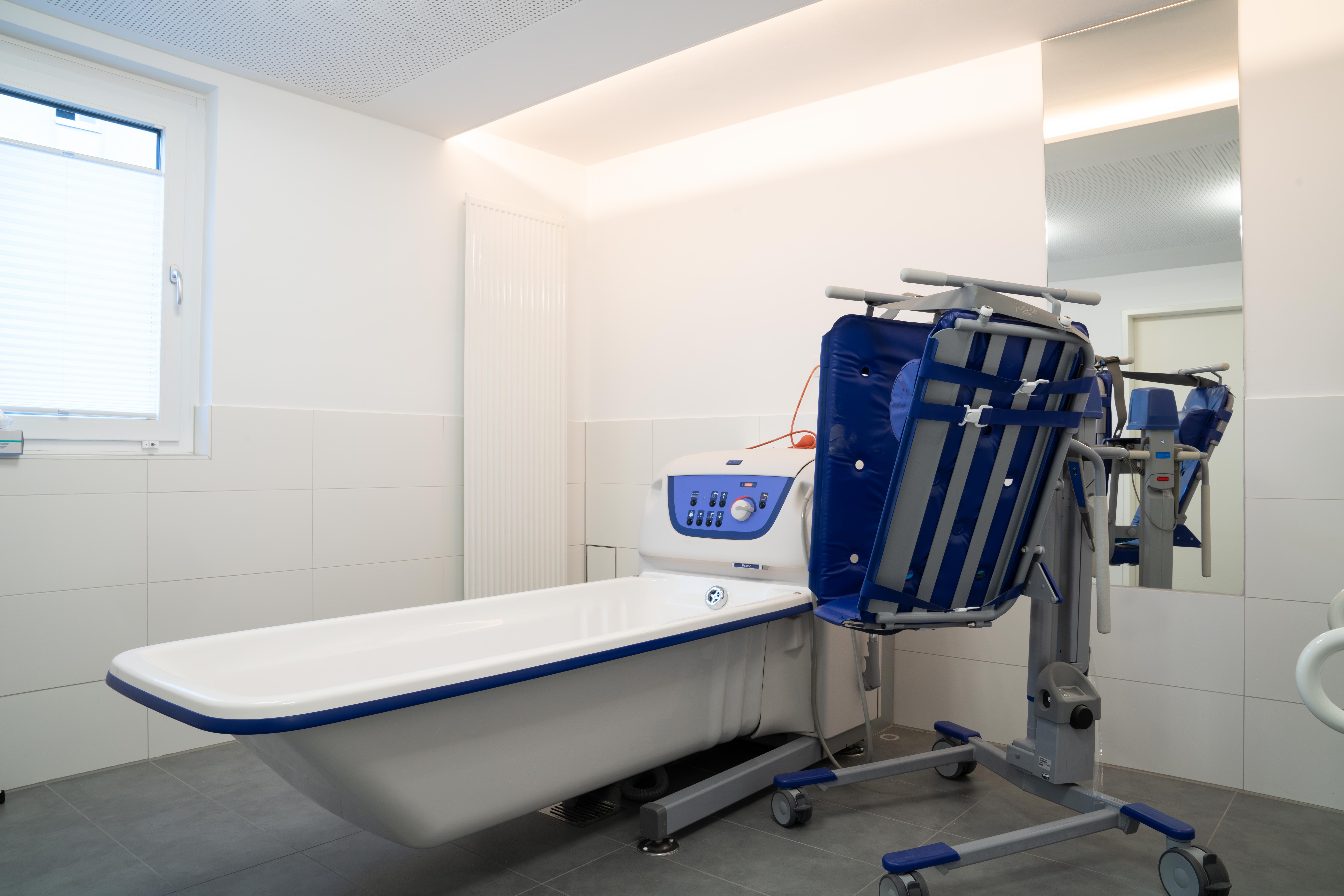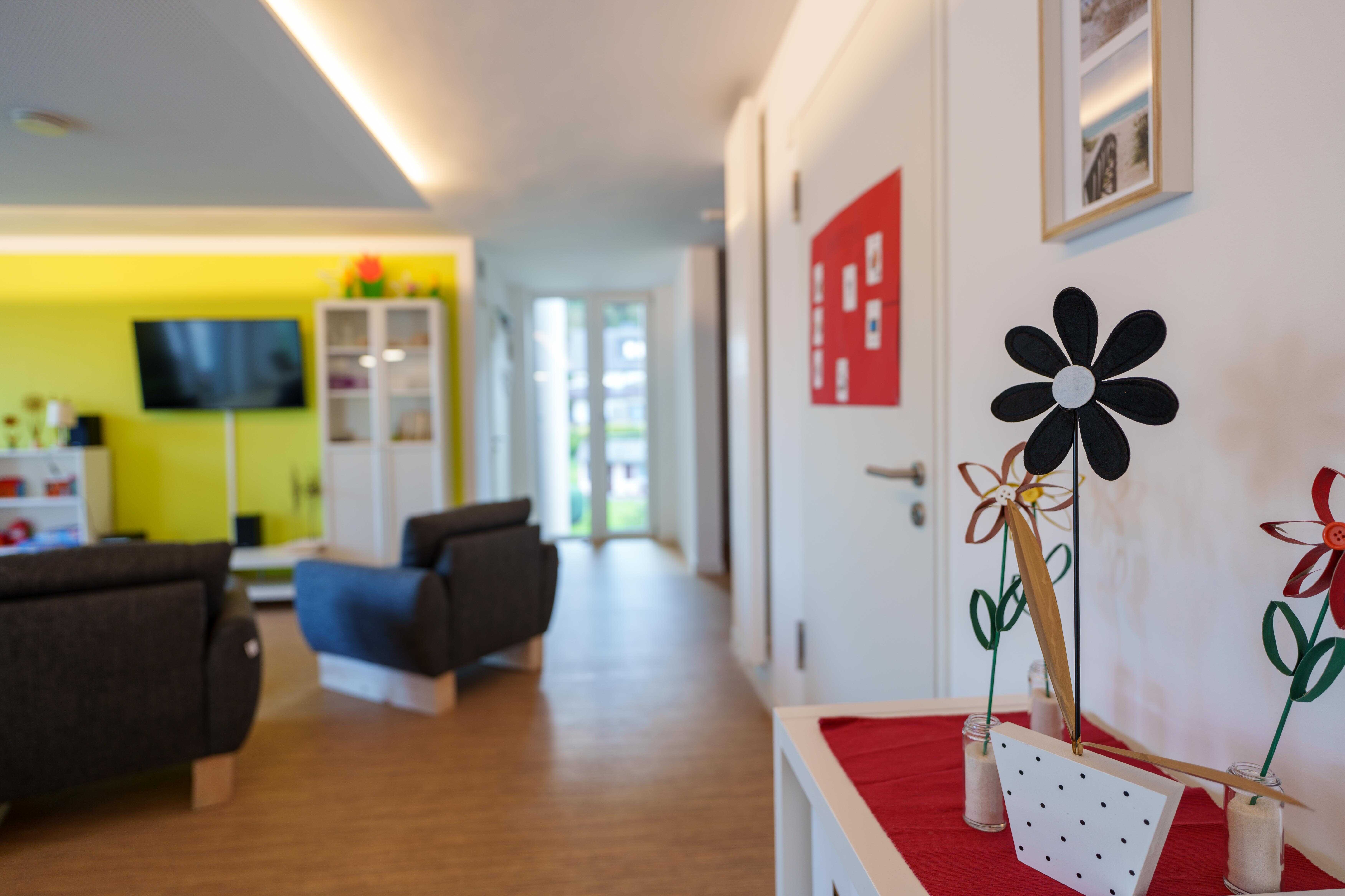 In der unteren Etage sind die Büros der Mitarbeiter*innen und der Schlafraum der Nachtbereitschaft, ein Hauswirtschaftsraum und ein Pflegebad untergebracht. Außerdem gibt es im Haus ein Zimmer mit Bad für Kurzzeitaufenthalte, beispielsweise wenn Angehörige oder Betreuer*innen eine Unterstützung benötigen oder im Krankenhaus behandelt werden müssen. Zum Wohnhaus gehören eine Terrasse und ein großer Garten.
