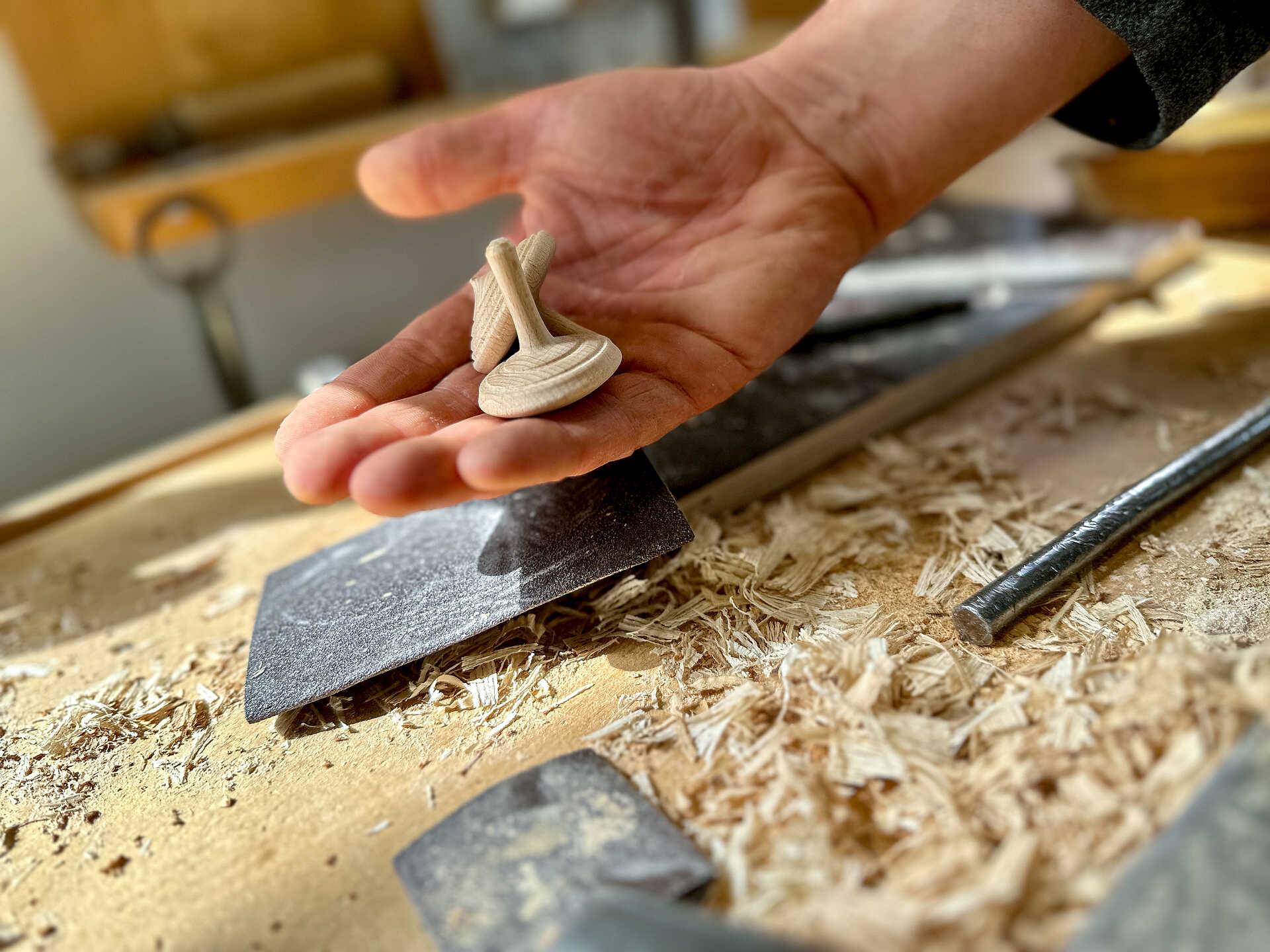 Die Arbeit mit Holz hilft ihm, seine Gedanken von der Sucht fernzuhalten und sich endlich gut aufgehoben zu fühlen. Nach nur zweieinhalb Jahren in unserer Einrichtung im Herzberghaus bei Breitenbach, ist der gelernte Elektriker schon fast zu einem Spezialisten für kleine Figuren, Griffe oder Schälchen geworden. In Eigenregie hat er zuletzt Drehkreisel produziert.