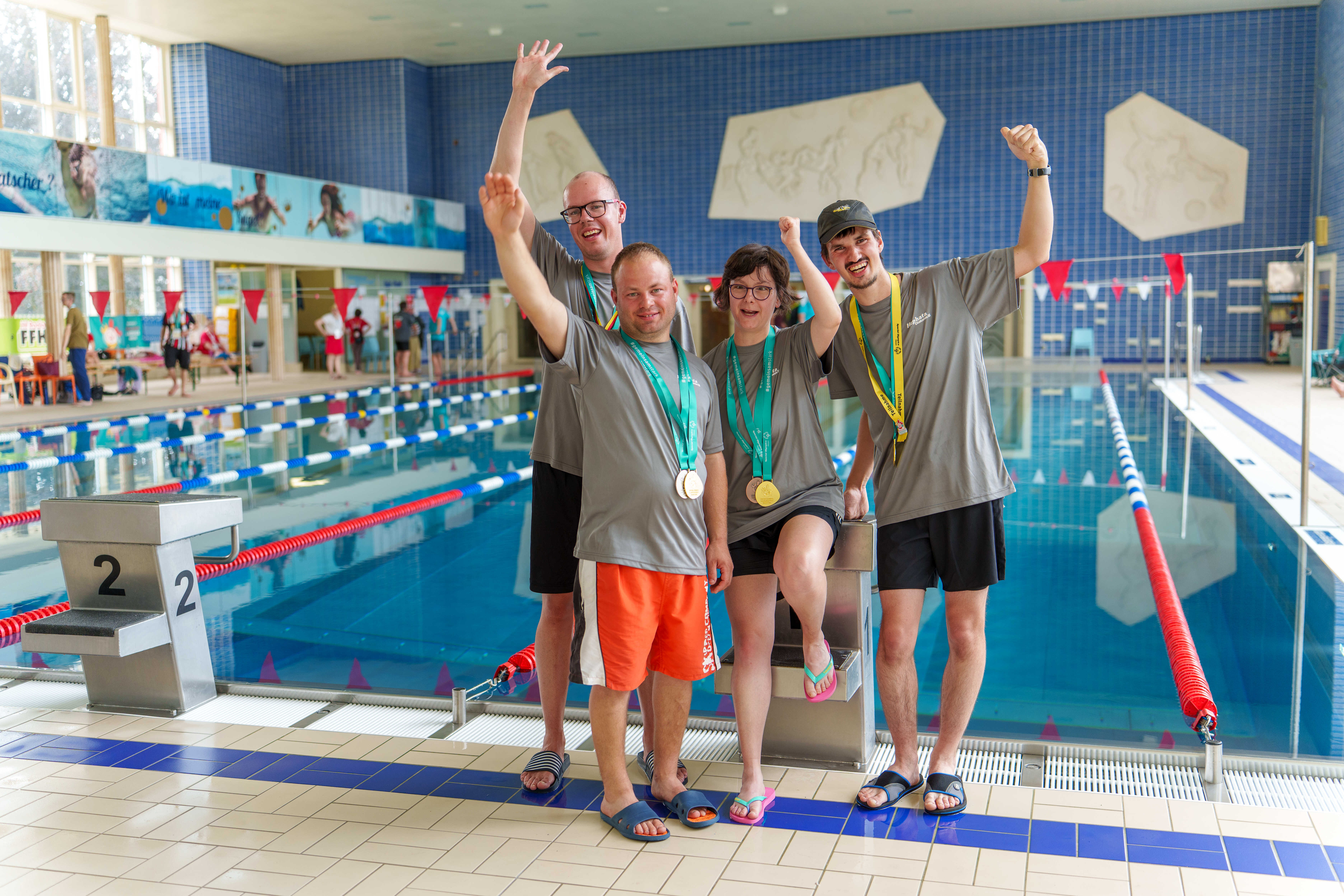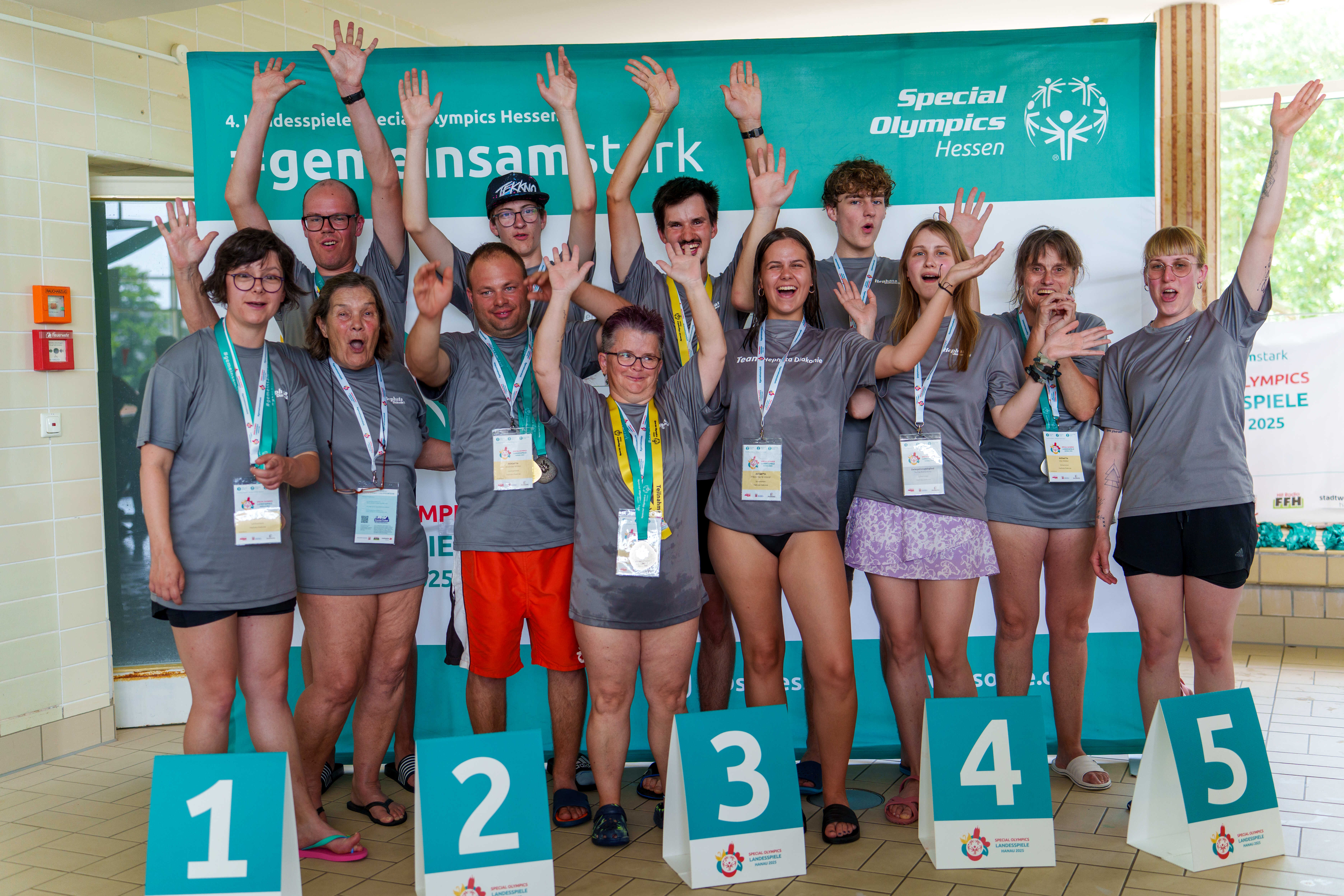 Bei den Landesspielen gibt es neben den Einzelwettbewerben auch sogenannte „Unified“ Wettbewerbe, in denen Menschen mit und ohne Behinderung gemeinsam als Mannschaft starten. Team Hephata hat eine Schwimm-Staffel und eine 4x400 Meter-Staffel gestellt.